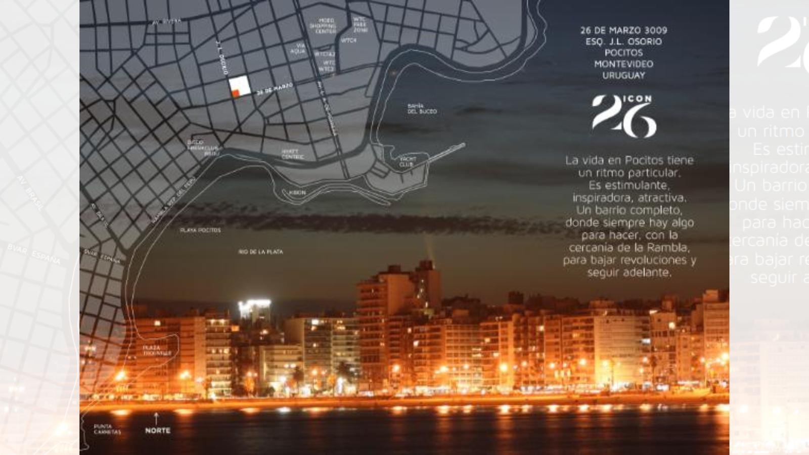 Se implanta con personalidad en la esquina de pocitos, sobre 26 de Marzo y Osorio, adecuándose a la dinámica de la calle con un gran basamento vidriado envuelto por una pasiva de columnas de doble altura. Pocitos, uno de los barrios más exclusivos y solicitados en Montevideo en una zona residencial y muy atractiva rodeado de servicios a pocos metros de la Rambla de Pocitos.