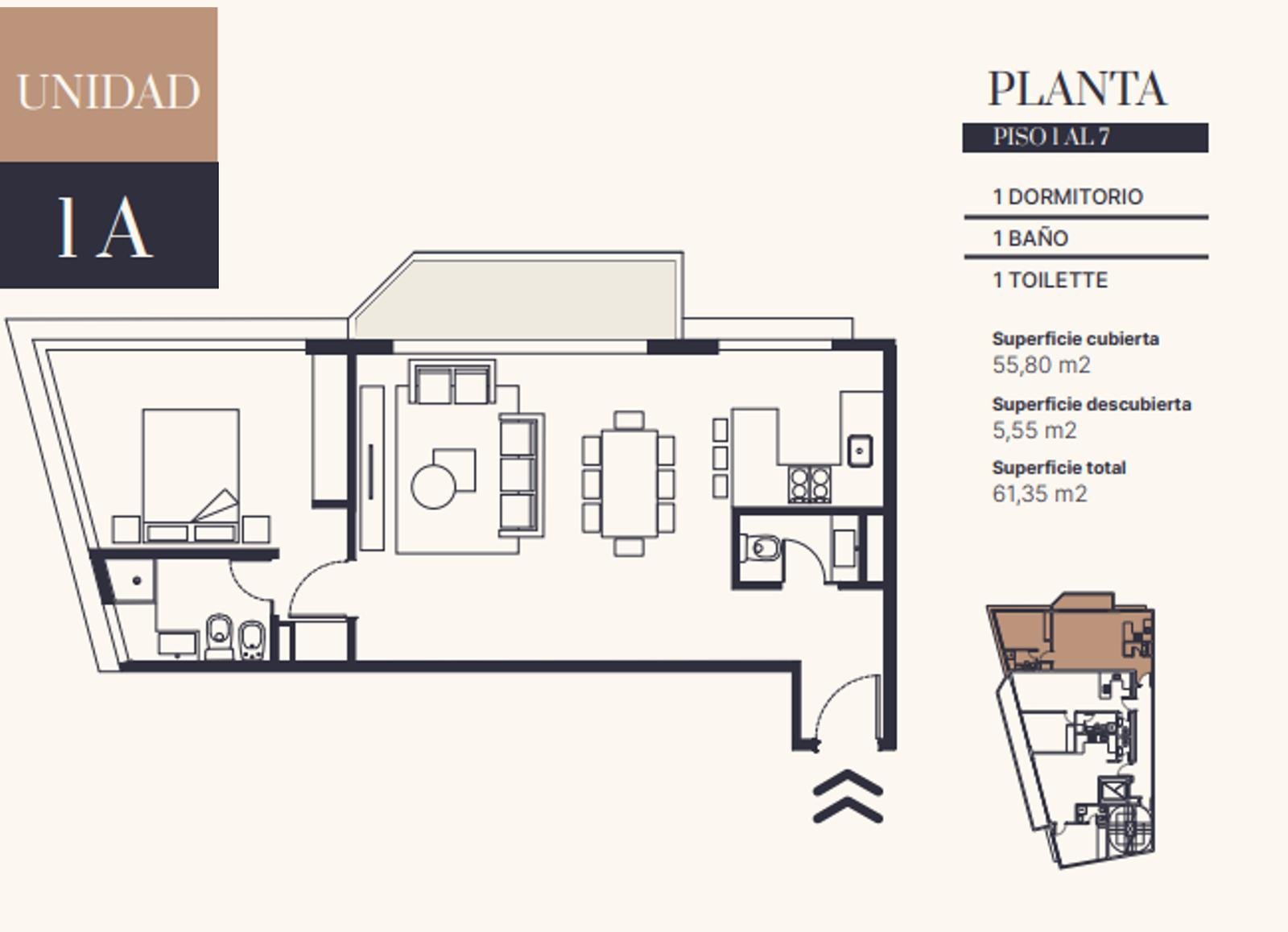 DISTRIBUCIÓNLiving comedor con salida a balcón corrido sobre esquina Terry y ValleCocina integrada con anafe eléctrico y mesada de granito negroDormitorio con placardBaño completo y toilette de recepciónSuperficie total: 62,27 m² (cubierta 56,74 m² + descubierta 5,53 m²)Disposición: frenteOrientación: noroesteAntigüedad: a estrenarEstado: excelenteExpensas: consultar
