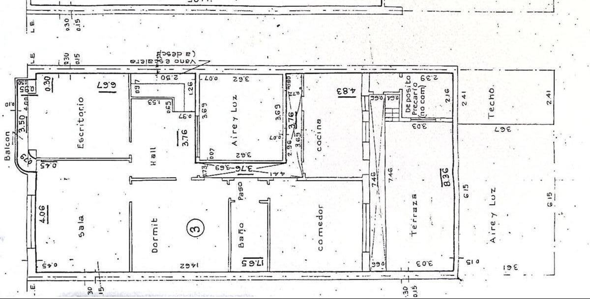 DISTRIBUCIÓNIngreso por primer piso al frenteLiving comedor amplio y luminosoCocina independiente para modernizarTres dormitorios bien proporcionadosDos bañosPatio propio en primer nivelEscalera interna de acceso a terrazaTerraza propia de grandes dimensiones con sectores cubiertos y semicubiertosSuperficie total: 242,85 m² (cubierta 116,20 m² + semicubierta 12,96 m² + descubierta 113,69 m²)Disposición: frenteOrientación: norteAntigüedad: 60 añosEstado: a refaccionarOcupación: vacía