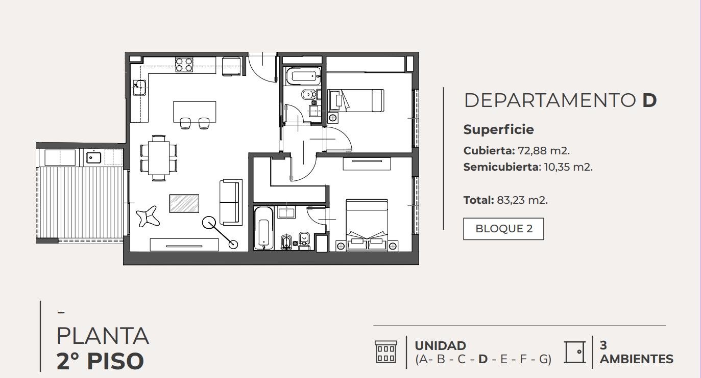 El espacio principal integra un cómodo Living-Comedor conectado a una Cocina integrada con ventilación. El diseño permite una fácil interacción mientras se cocina y se comparte.Balcón con Acceso Directo: brindando luz natural y ventilación a todo el sector, tu lugar ideal de relaxCuenta con un dormitorio principal en suite y un segundo dormitorio ideal como habitación infantil, oficina o estudio.Dos baños completos (uno en suite y uno social), lo que garantiza privacidad y fluidez para la vida diaria de la familia o al recibir visitas.