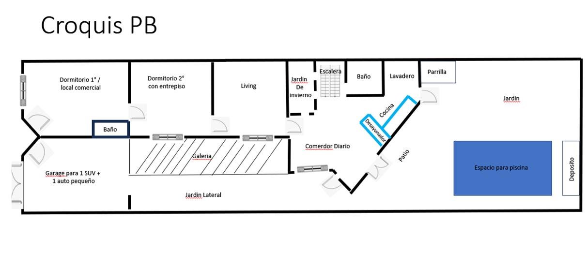 AMENITIES / EXTERIORES- Galería semicubierta.- Jardín lateral y jardín de fondo con parrilla.- Piscina (a reacondicionar).- Galpón / depósito.