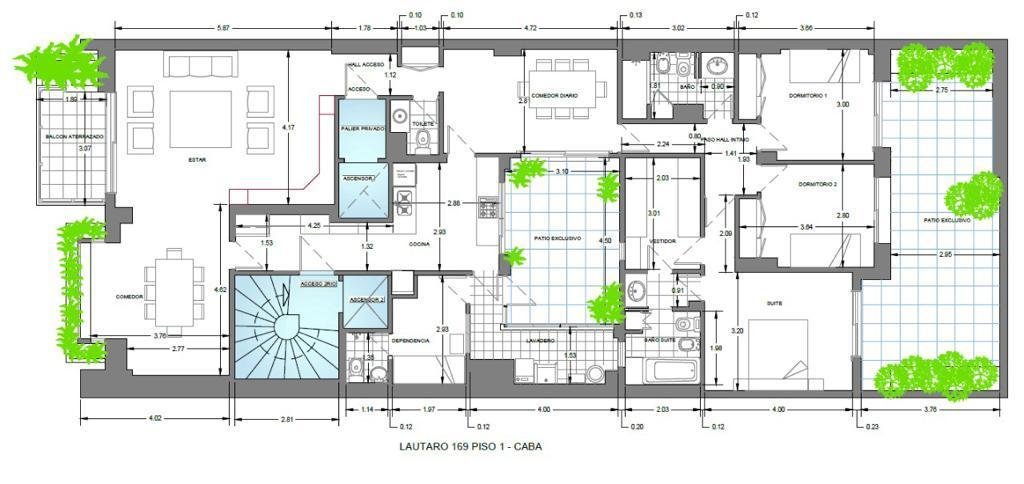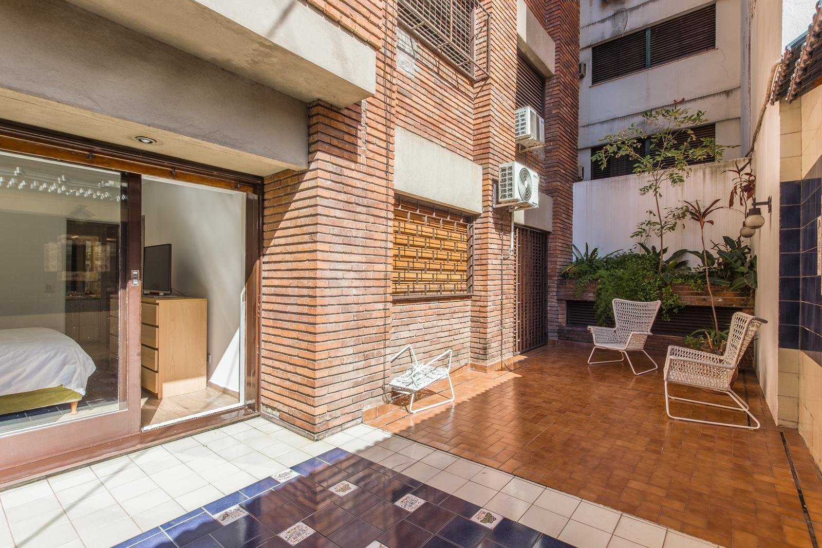 Desde dos de los dormitorios se accede a un patio trasero de aproximadamente 3 metros de profundidad a lo ancho del edificio.Además, la unidad cuenta con un patio interno visible desde la cocina, comedor diario y el lavadero, que aporta luz y ventilación.