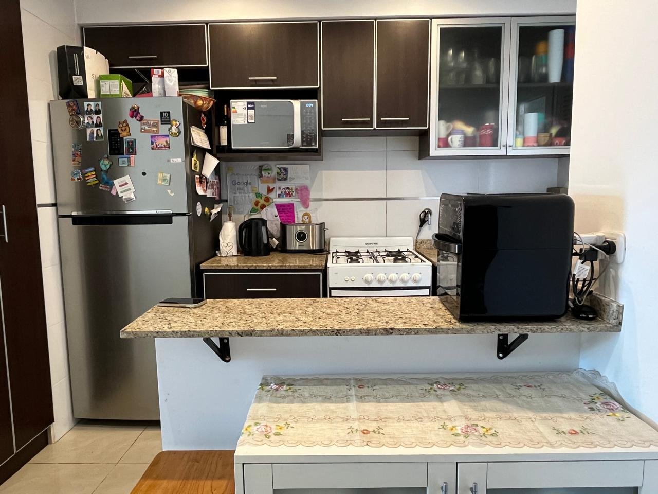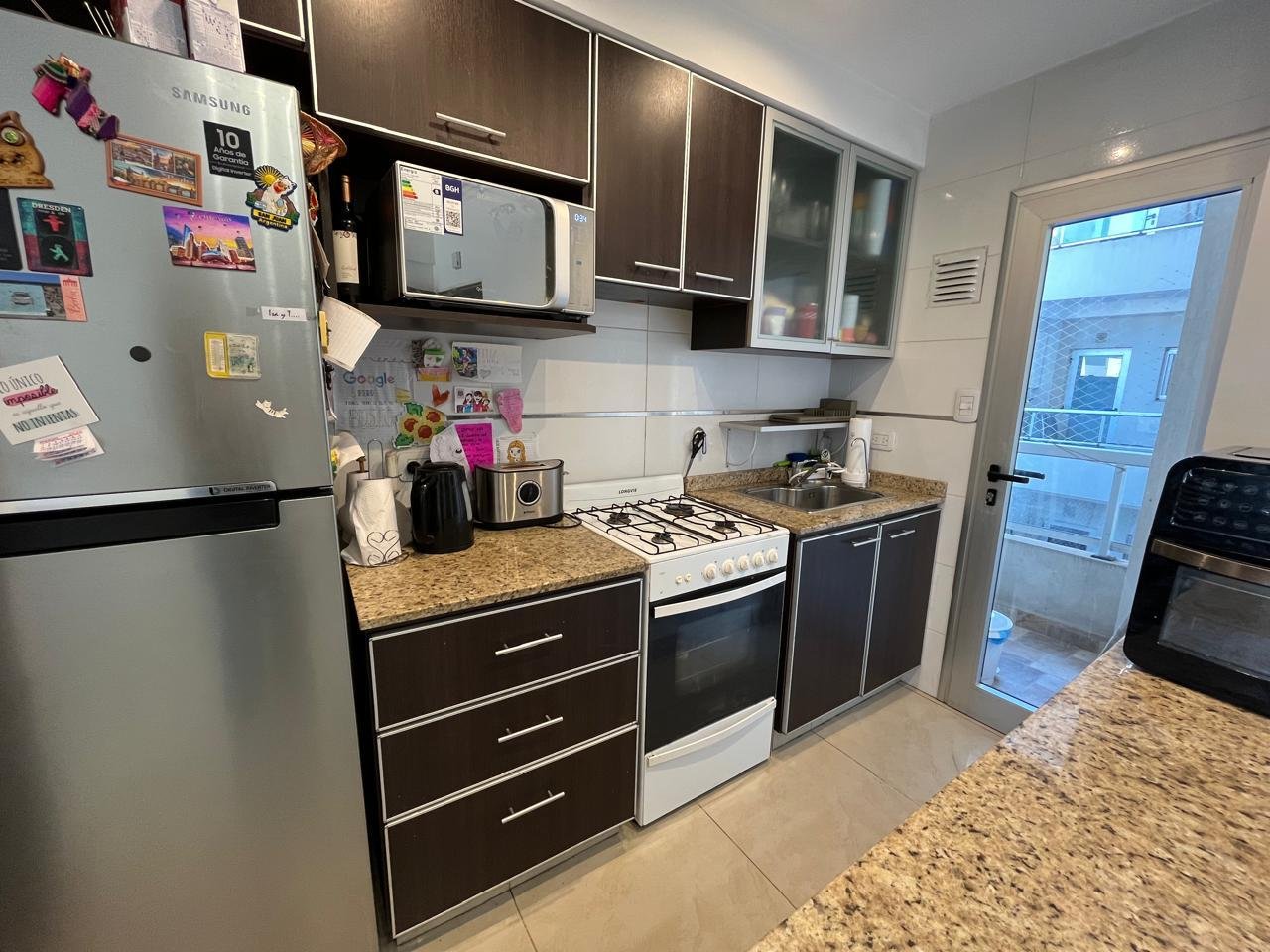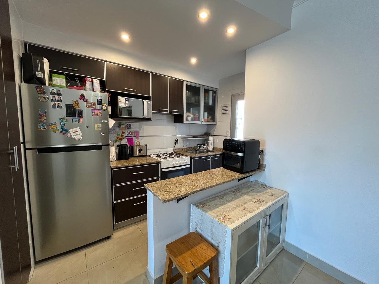 . Cocina integrada con barra desayunadora, equipada con muebles bajo mesada y alacenas que brindan gran capacidad de guardado. Espacio cómodo y funcional ideal para el uso diario y conectado al área social del departamento.