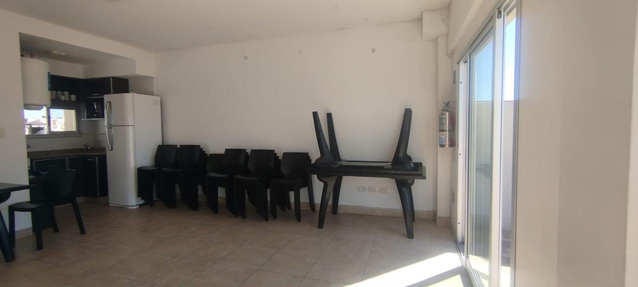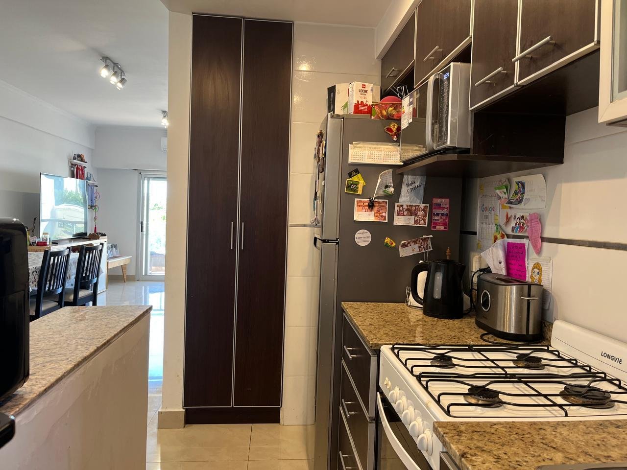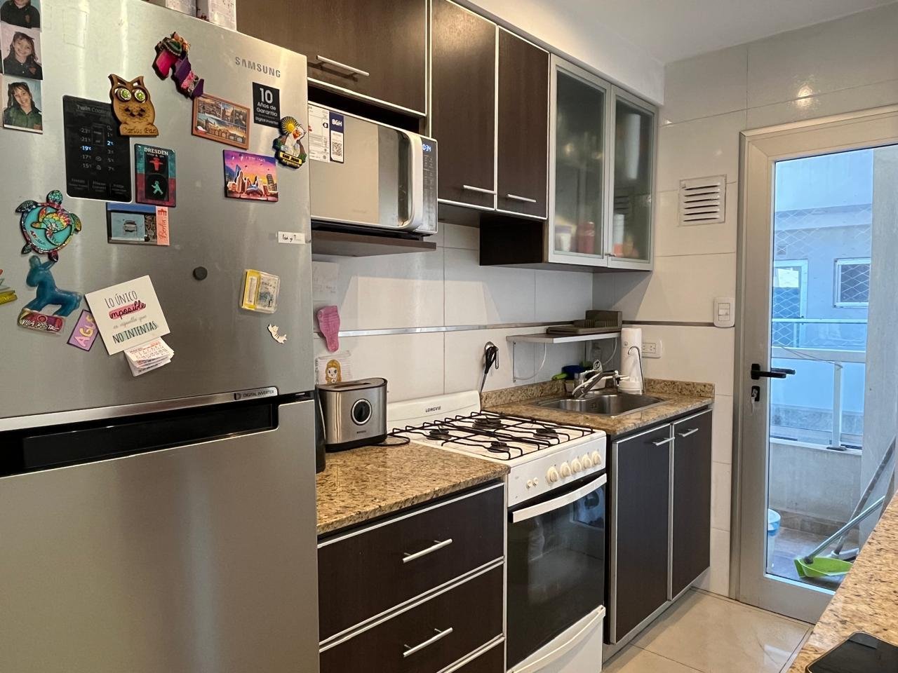 . Cocina integrada con barra desayunadora, equipada con muebles bajo mesada y alacenas que brindan gran capacidad de guardado. Espacio cómodo y funcional ideal para el uso diario y conectado al área social del departamento.
