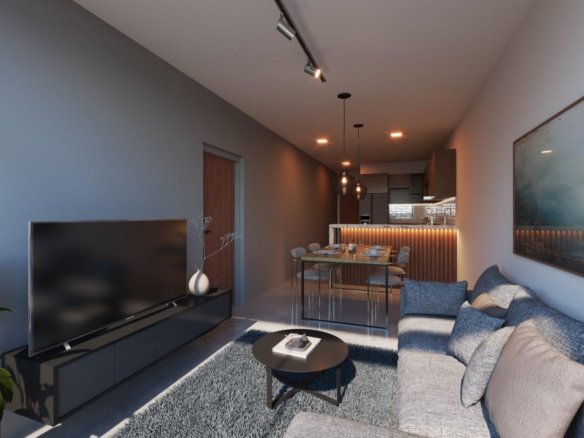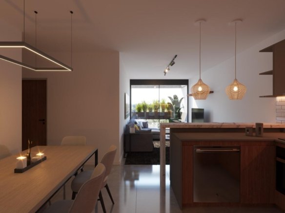 DistribuciónLiving comedor amplio con cocina integradaBarra desayunadoraLavadero incorporadoDormitorio con placard de cómodas dimensionesBaño completo con bañera y mampara de blindexBalcón con vista abierta